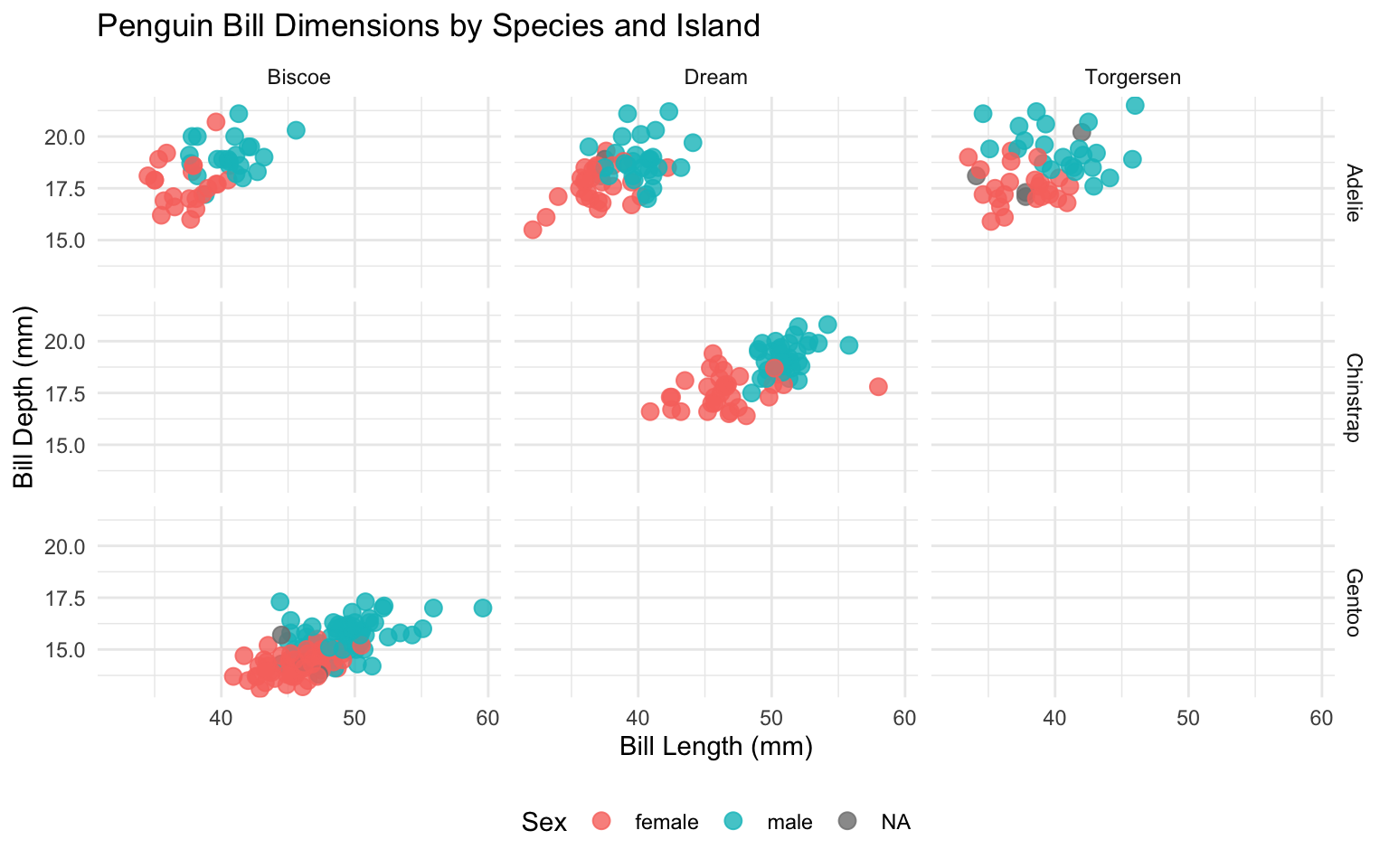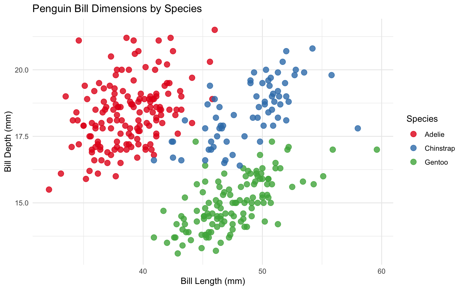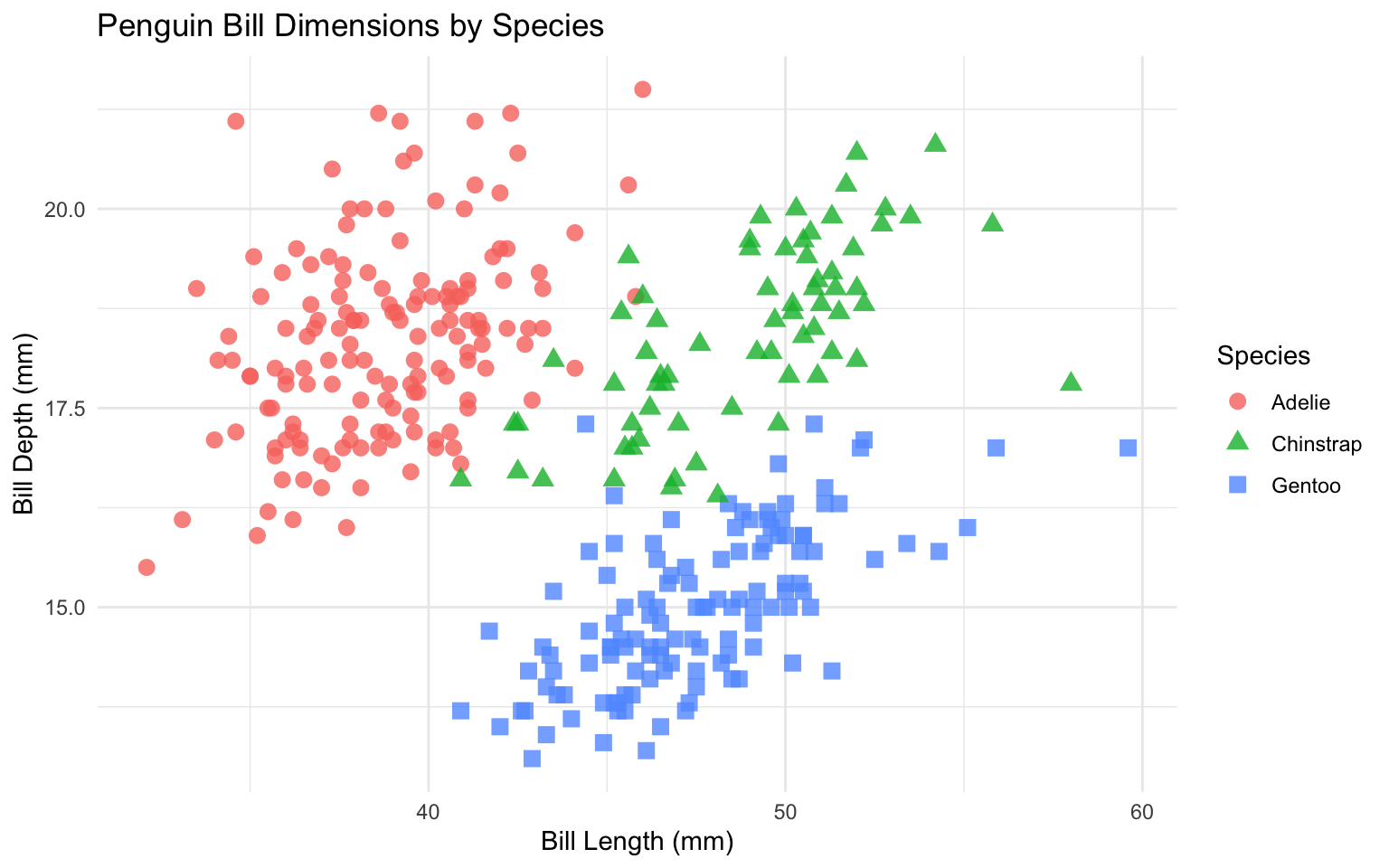 ggplot(data = penguins, aes(x = bill_length_mm, y = bill_depth_mm, color = species, shape = species)) +