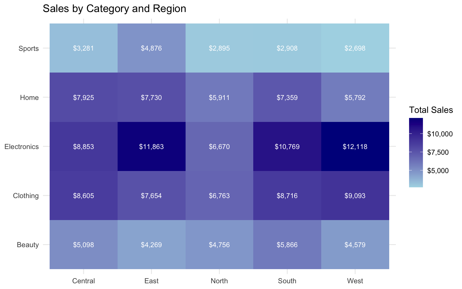p4 <- ggplot(data = category_region_sales, aes(x = region, y = category, fill = total_sales)) +