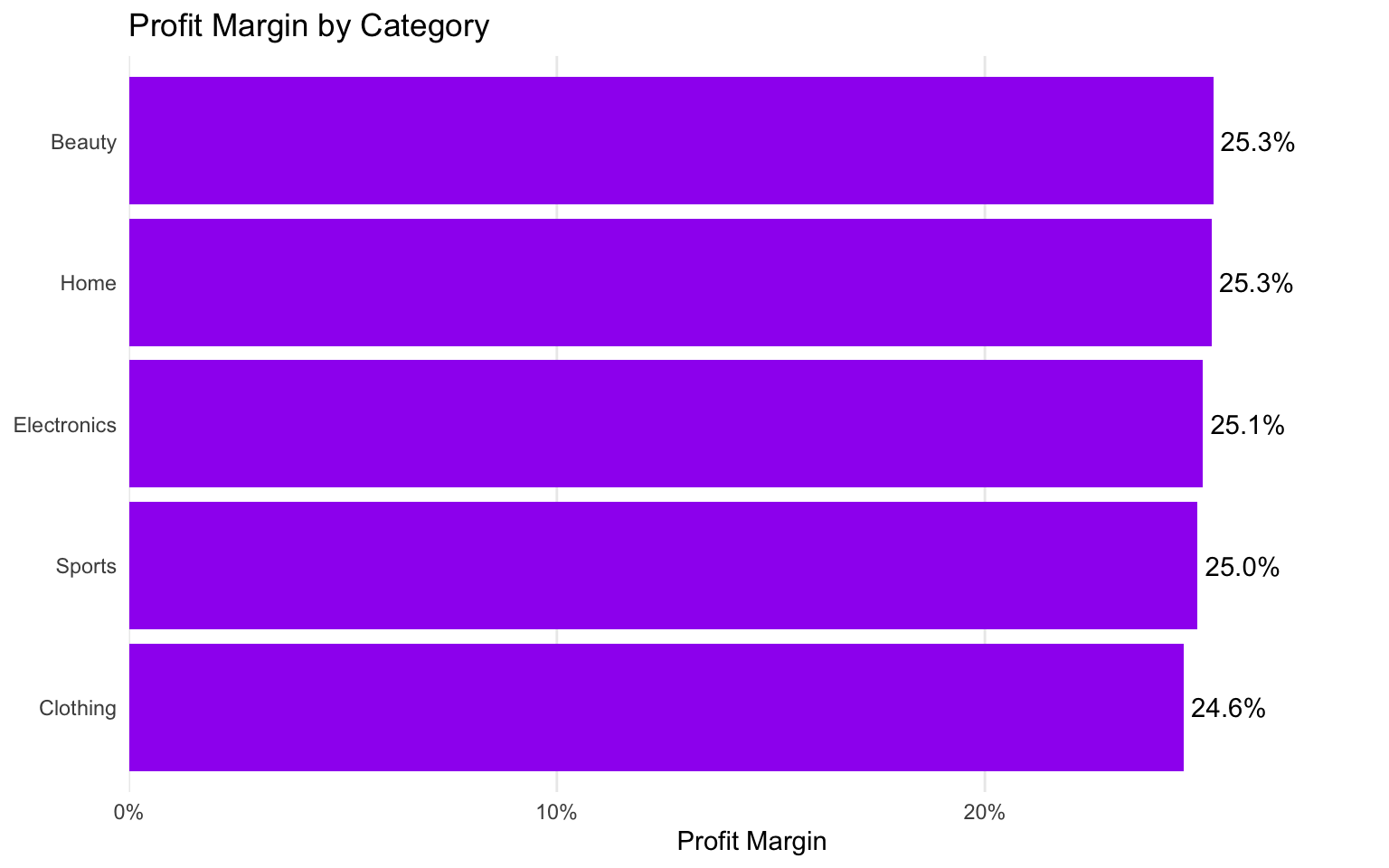 - Profit Margins: Beauty products have the highest profit margin, followed by Sports and Home products, despite lower total sales.