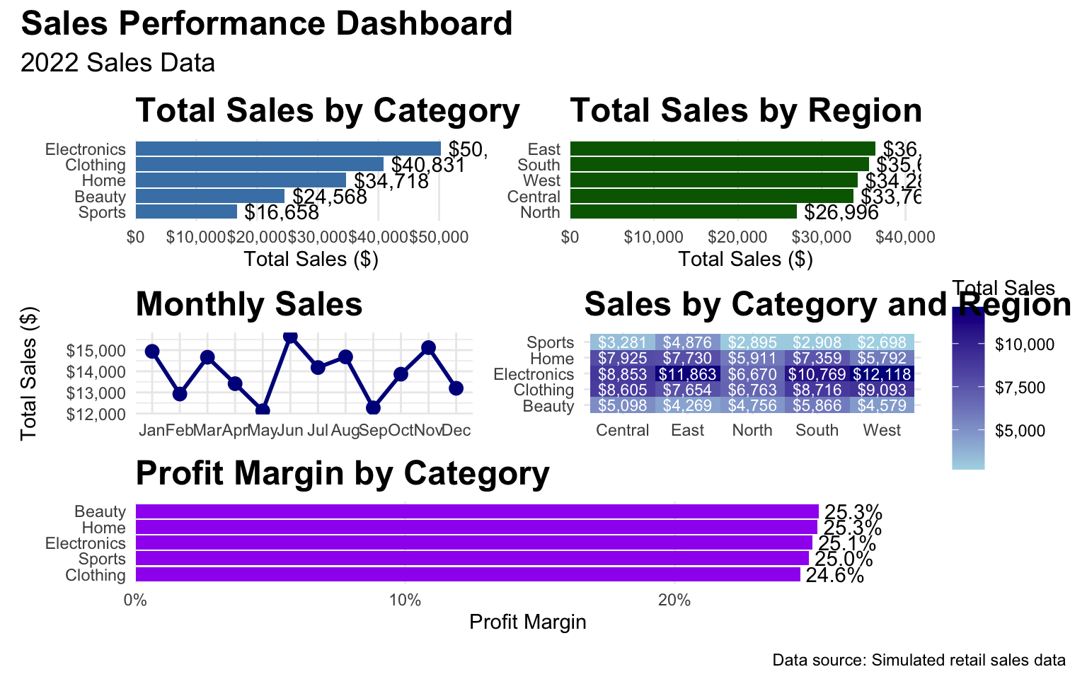 - Category-Region Analysis: Electronics performs particularly well in the East and West regions, while Clothing has strong performance across all regions.