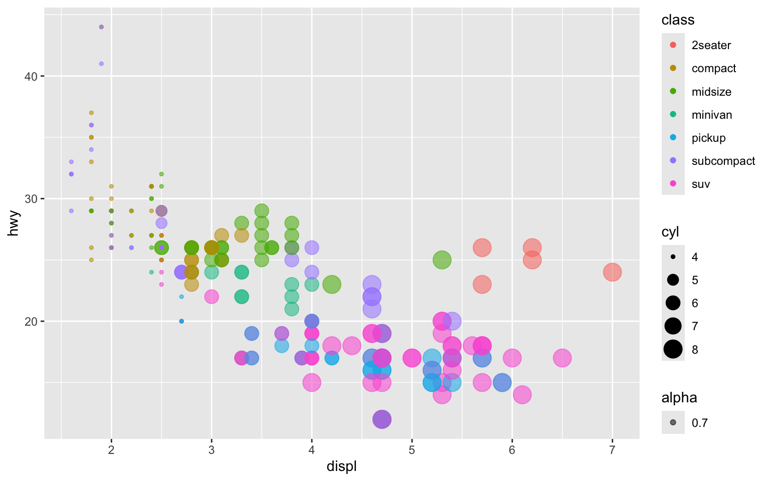geom_point(mapping = aes(x = displ, y = hwy, color = class, size = cyl, alpha = 0.7))