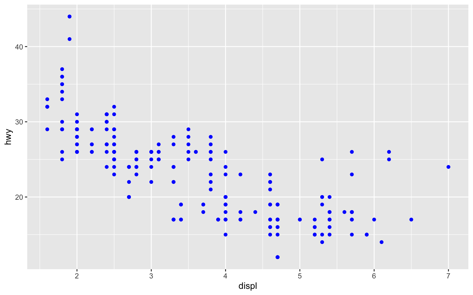 geom_point(mapping = aes(x = displ, y = hwy), color = "blue")