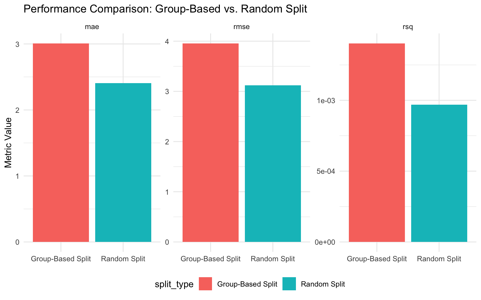 The comparison above illustrates an important point: random splitting often leads to overly optimistic performance estimates when dealing with grouped data. This is because: