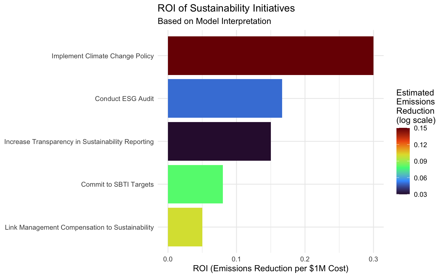 - Link Management Compensation to Sustainability: Lowest ROI due to high cost, though with substantial emissions impact.
