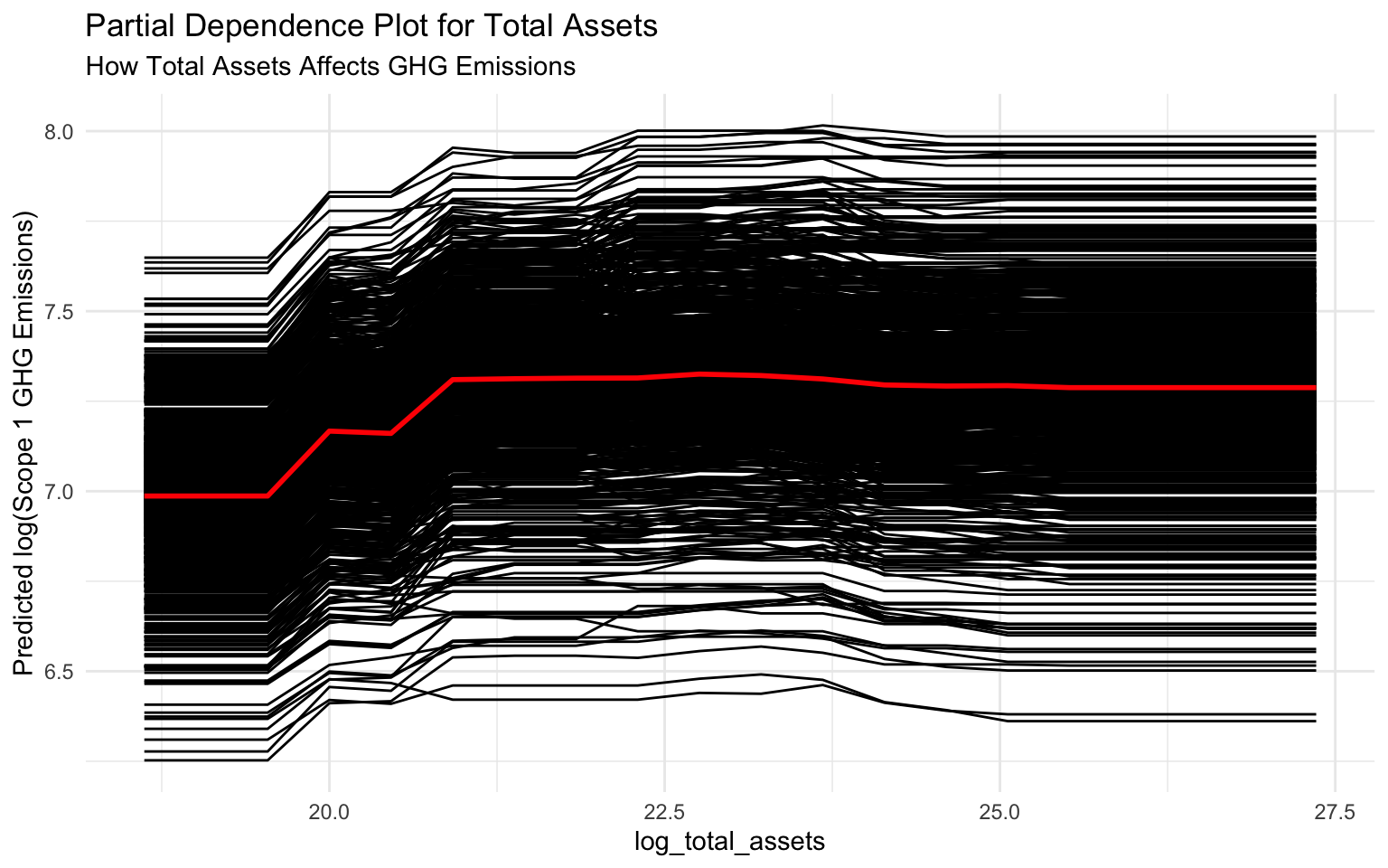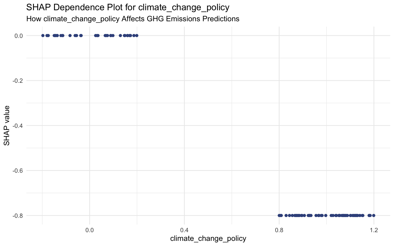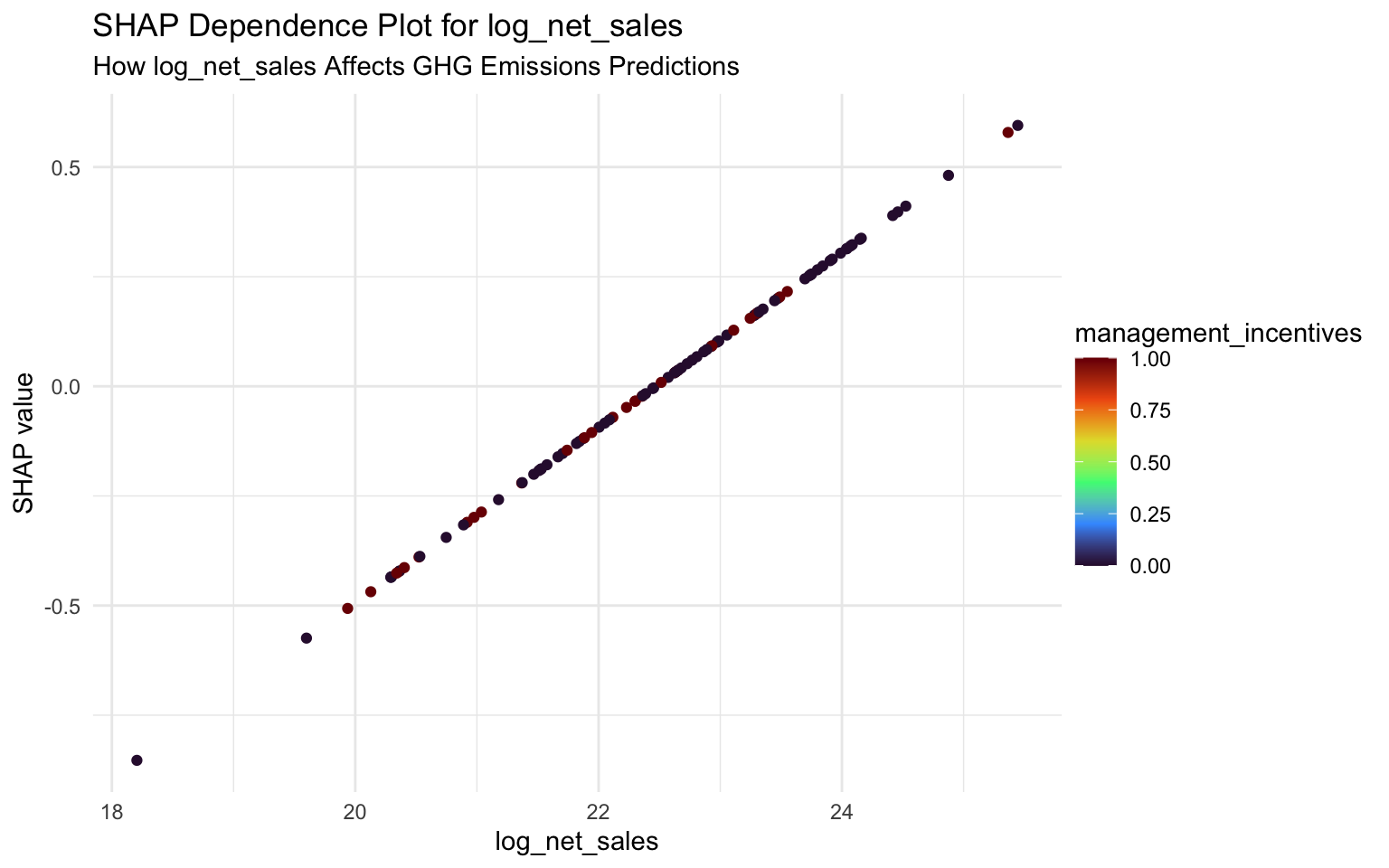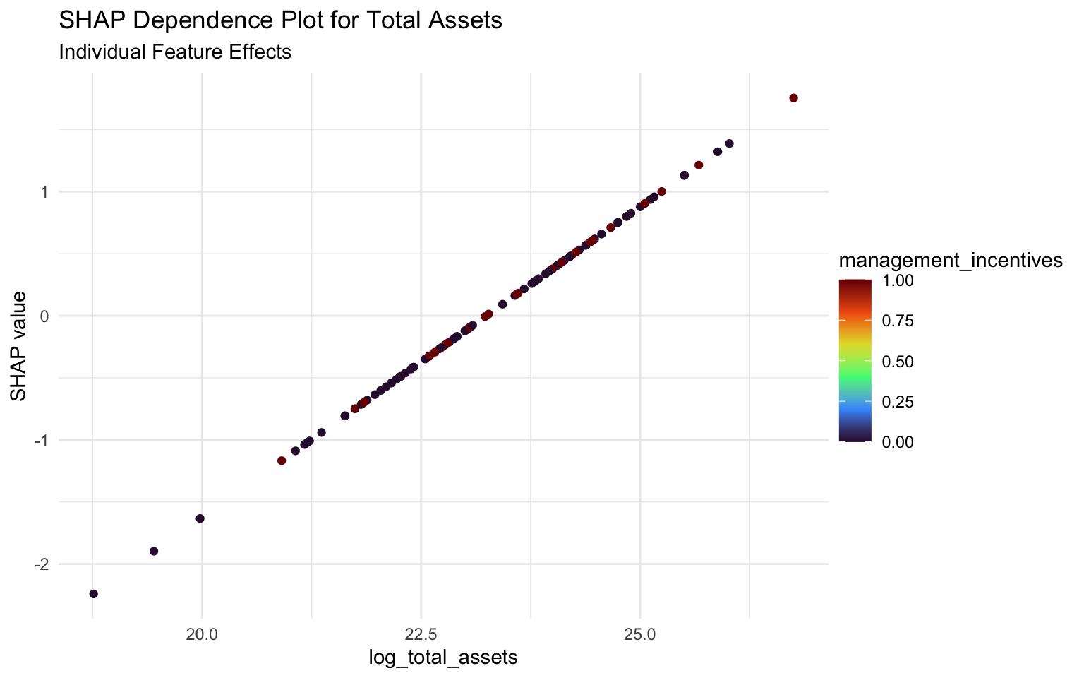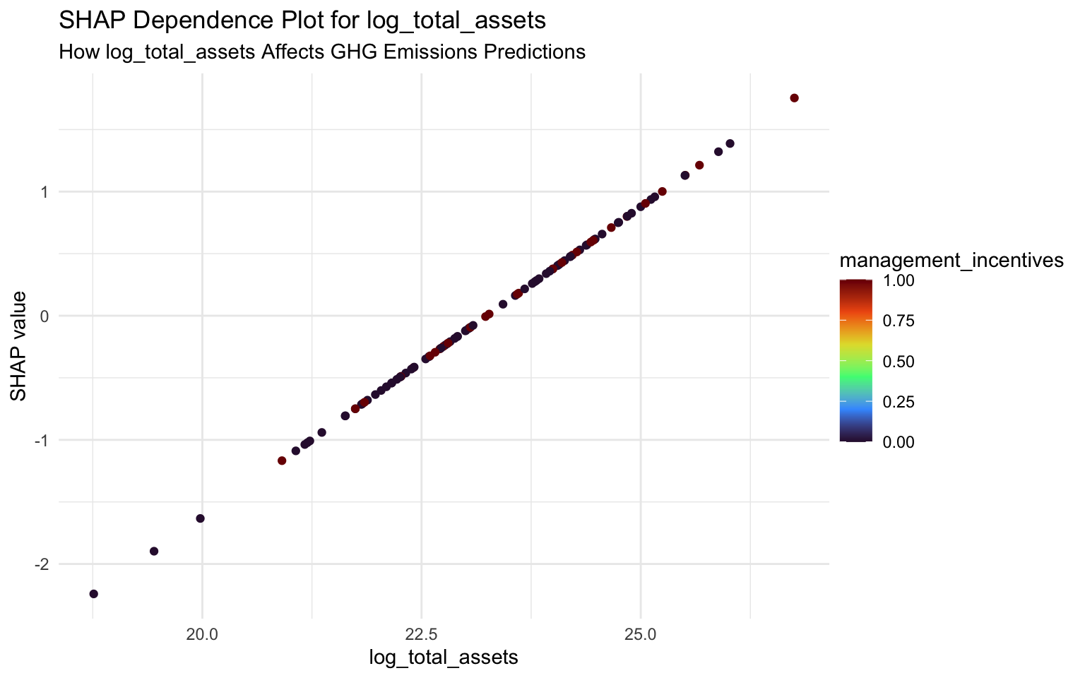 - Create SHAP interaction plots for different pairs of features (e.g., log_total_assets and climate_change_policy).